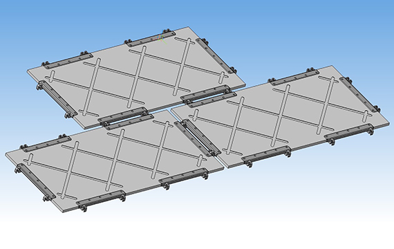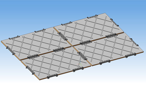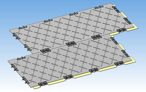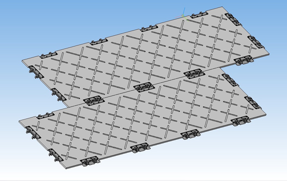 Композитные многофункциональные плиты полимерные КМП-С используются в качестве сборно-разборных покрытий при сооружении временных технологических дорог и временных площадок. Конструкция плиты состоит из полимерного материала с системой креплений, позволяющей собирать из плит различные формы и типоразмеры твердого покрытия.